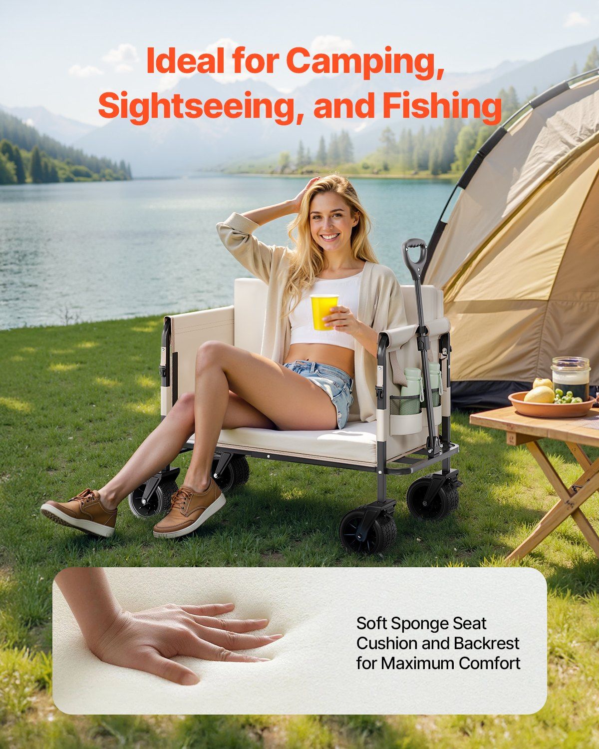 1.Multi-Functional Design: This foldable wagon cart is ideal for hauling heavy items and can instantly convert to a comfortable sofa! The side-opening design with a high-elasticity foam cushion allows the beach cart to quickly expand into a 75cm wide sofa. Whether you're camping, vending, or hosting family gatherings, enjoy your break without the need to carry an extra seat, saving you effort and space.